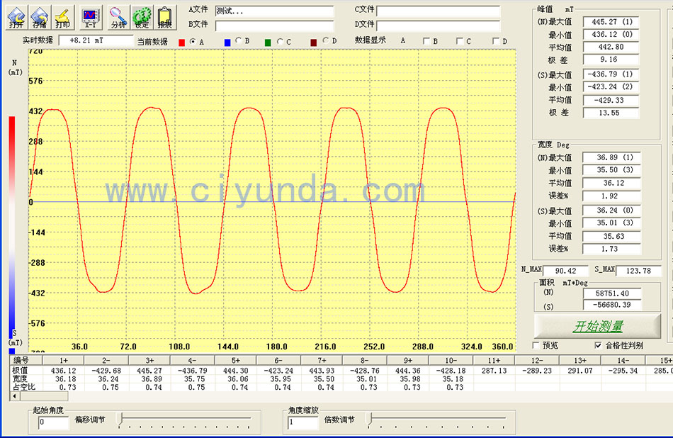 峰值是指每一個磁極的磁感值的最高點,單位為mT,1mT=10高斯。上圖我們可以看到有10個峰值,也就是說這個磁力輪是10級的。由于每個磁析的峰值不可能完全相等,所以有峰值的最大值,最小值,還有平均值。極差則是最大值和最小值之間的差。